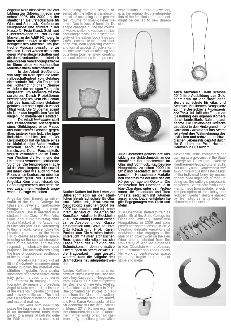 Julia Obermaier und Alexandra Seuß ihre Arbeiten im EINGANG NORD der Pinakothek der Moderne. Die arbeiten zeigen die breit gefächerte Weiterentwicklung von vier Künstlerinnen, die den Grundstein ihrer Arbeit an der Staatlichen Berufsfachschule für Glas und Schmuck, Kaufbeuren-Neugablonz gelebt haben.